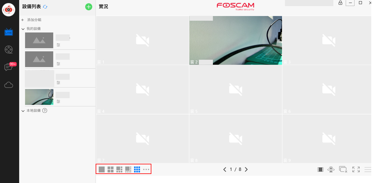 FOSCAM VMS 開啟FOSCAM VMS → 點選下圖紅框,可選擇想分割的數量。再將想觀看之攝影機拖拉至分個畫面,即可觀看。 FOSCAM APP1. 開啟FOSCAM APP → 主頁 → 點選右上角分割畫面,如下圖。 2.點選分割畫面後即可觀看。(若攝影機數量超過4台,則右滑會顯示其他四路影像) 3. 若只想分割一個畫面,則點選攝影機畫面兩下即可,右滑也可觀看其他台攝影機畫面。 補充:若想改變攝影機分割畫面順序,則需至我的 → APP設定。 2.點選設備順序排序,即可自行調整順序。 注意:l FOSCAM VMS最多支援8×8分割。 l FOSCAM APP無法選擇要幾分割,只支援1分割及2×2分割。
